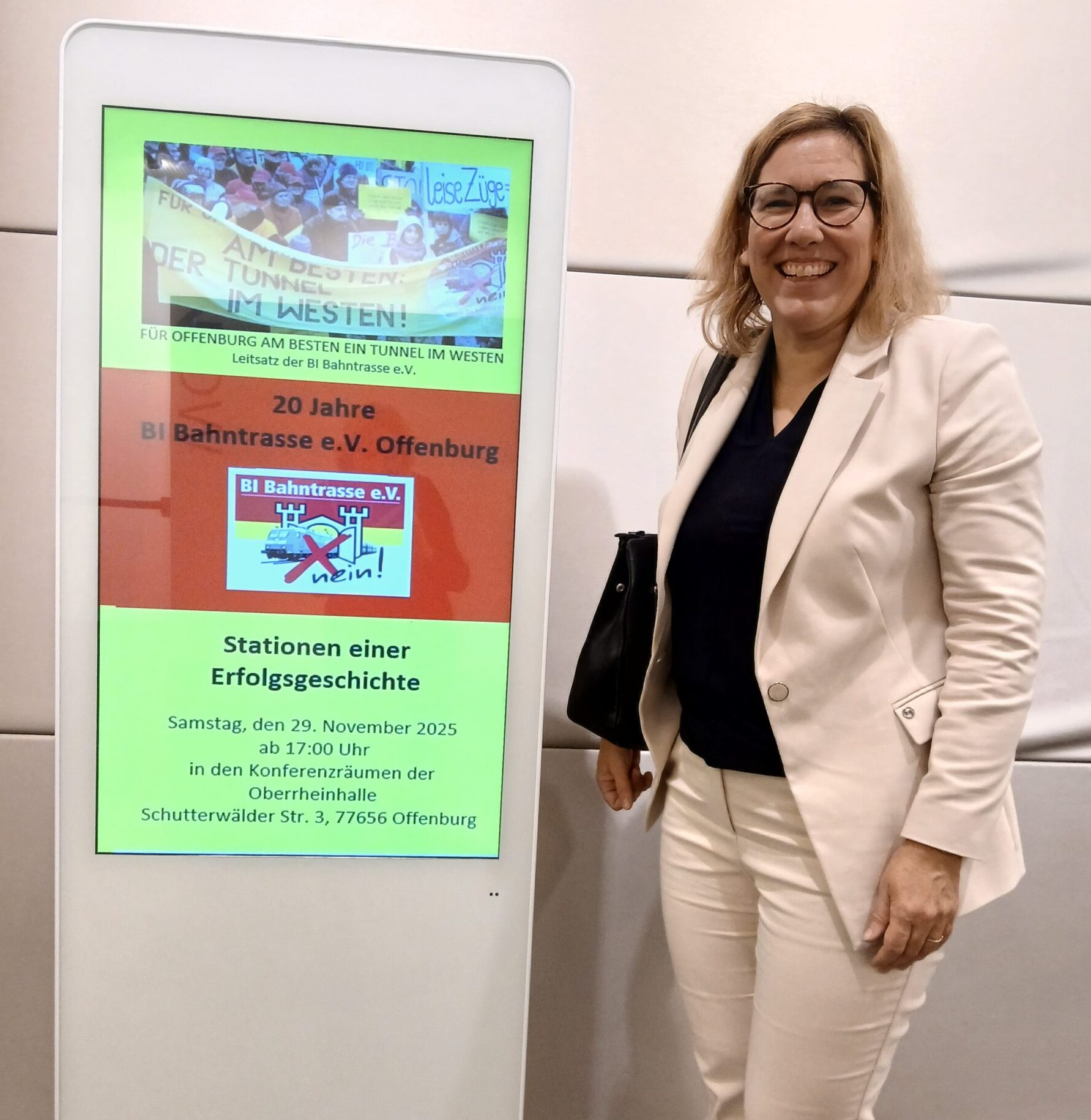 Beim 20-jährigen Jubiläum der BI Bahntrasse wurde das unermessliche Engagement, das Verantwortungsgefühl und die Weitsicht der aktiven Mitglieder deutlich. Seit den 70er Jahren wurden von der Bahn Pläne zum vierspurigen Ausbau der Rheintalbahn entwickelt. Durch Offenburg sollten zwei weitere Gleise für Güterzüge führen. Abriss von ganzen Häuserreihen, von Infrastruktur, Dauerlärm und Dauererschütterung in mehreren Schulen, Wohnhäusern, Arbeitsplätzen, eine durch einen breiten Bahngraben getrennte Stadt wären die Folge gewesen.